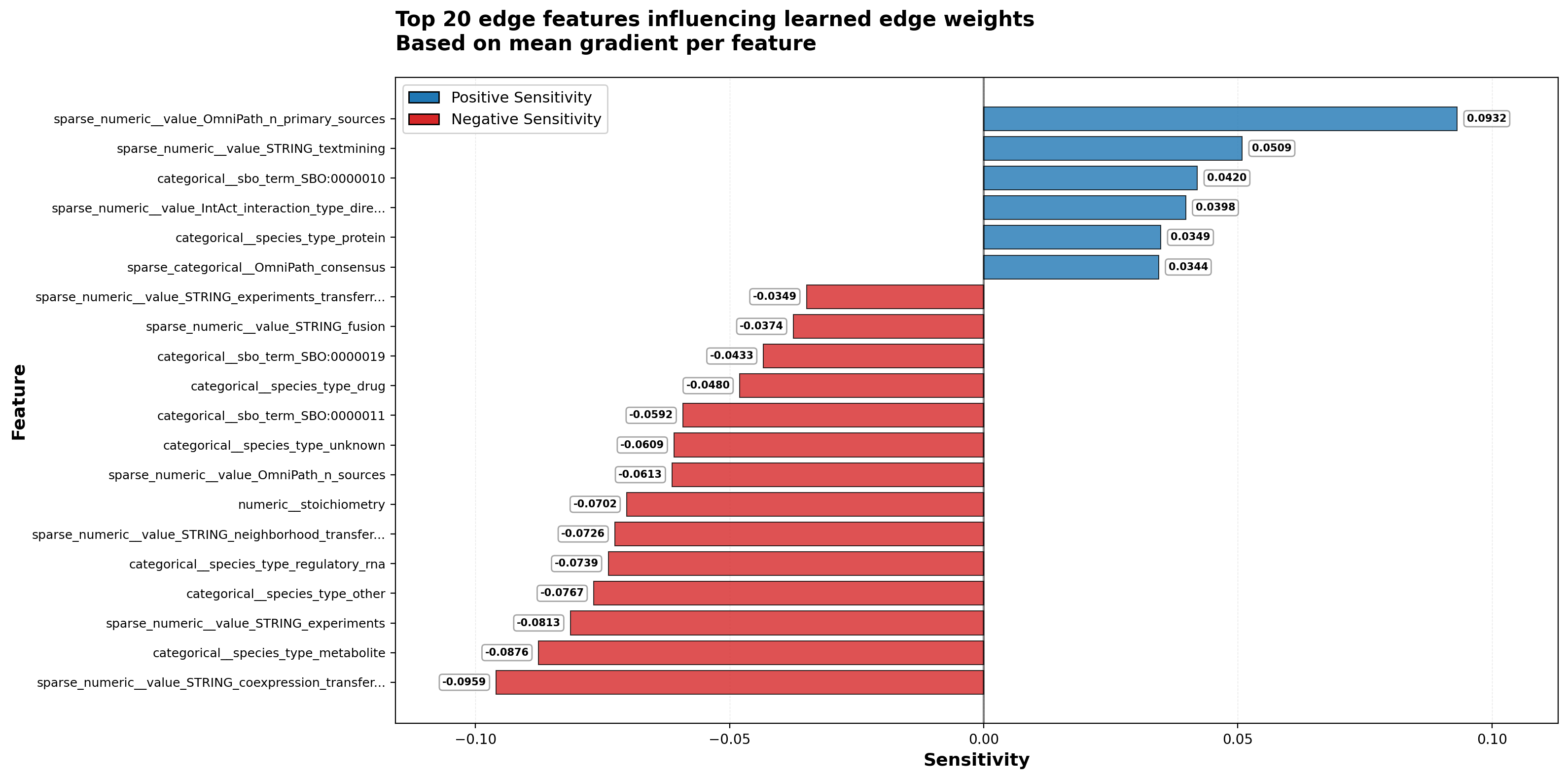 Interpreting individual features is complicated by the edge encoder’s nonlinear combinations. For example, OmniPath primary sources show strong positive sensitivity while total OmniPath sources show negative sensitivity, suggesting the model values concentrated evidence from specific high-quality sources over diffuse evidence from many sources.