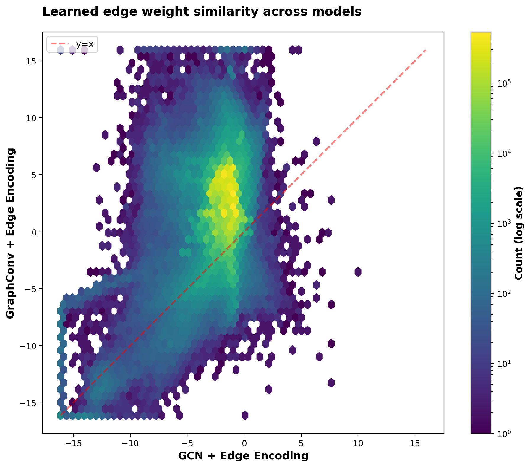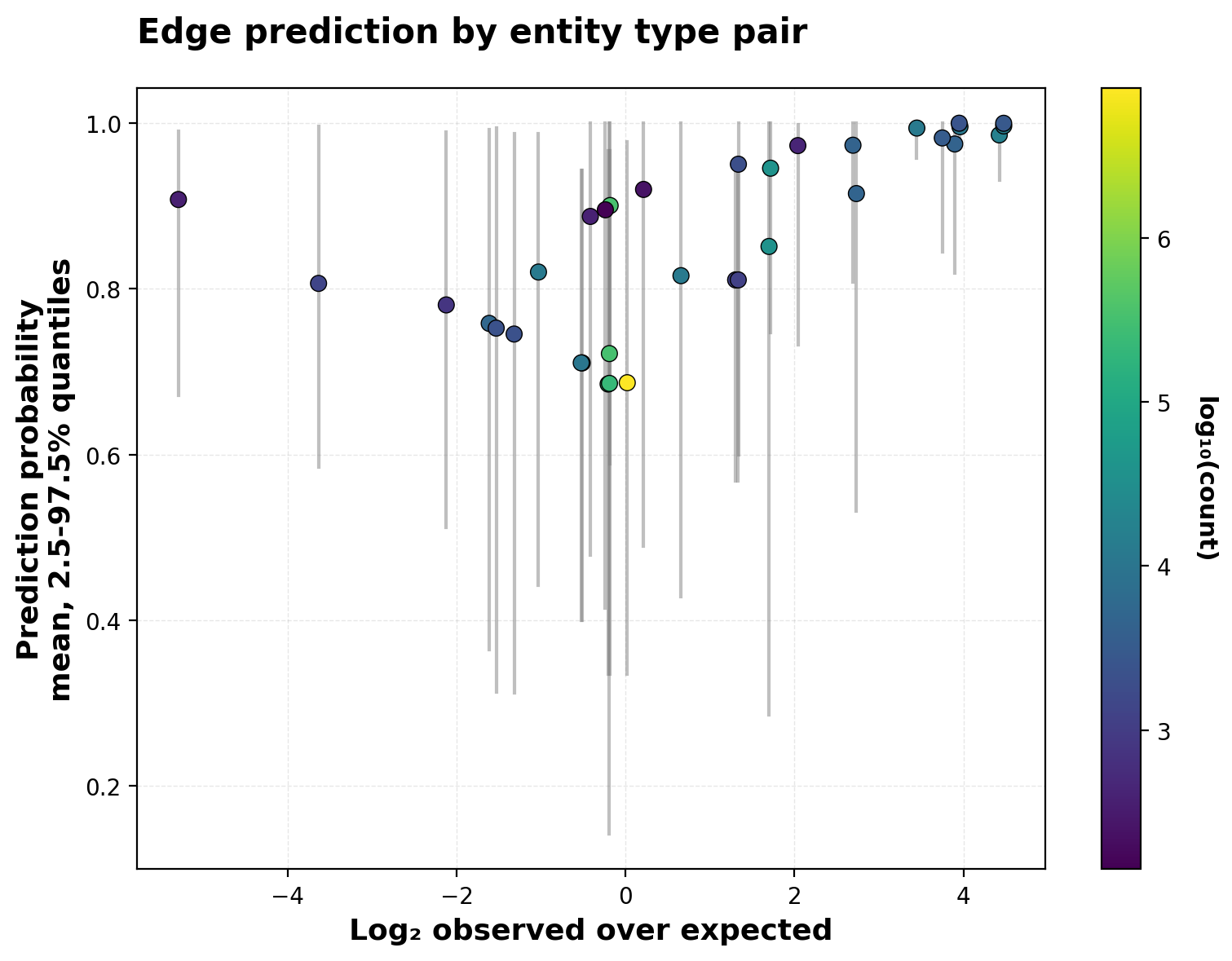The plot reveals two distinct patterns. For common edge types — particularly protein→protein interactions (bright yellow, log₂ O/E ≈ 0) — real edges and negative samples occur at similar frequencies, yet the model’s predictions span a wide range (0.3-1.0). This indicates the model is learning patterns of vertex similarity that go beyond trivial features like entity type. The model differentiates among protein pairs based on their learned embeddings, not just their shared protein identity.